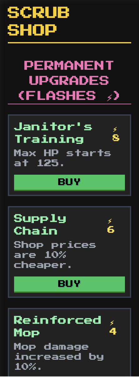 Grab your mop, load your Scrub-Shotgun, and prepare for a neon-drenched, pixel-art fight for floor cleanliness! This is a fast-paced, top-down action game where you're the Janitor cleaning up floors infested by slimes and zombies. Survive, earn Scrub Coins, unlock permanent upgrades like the Freeze Gun and Flamethrower, and face off against epic Boss Blobs. The ultimate cleaning mission starts now!